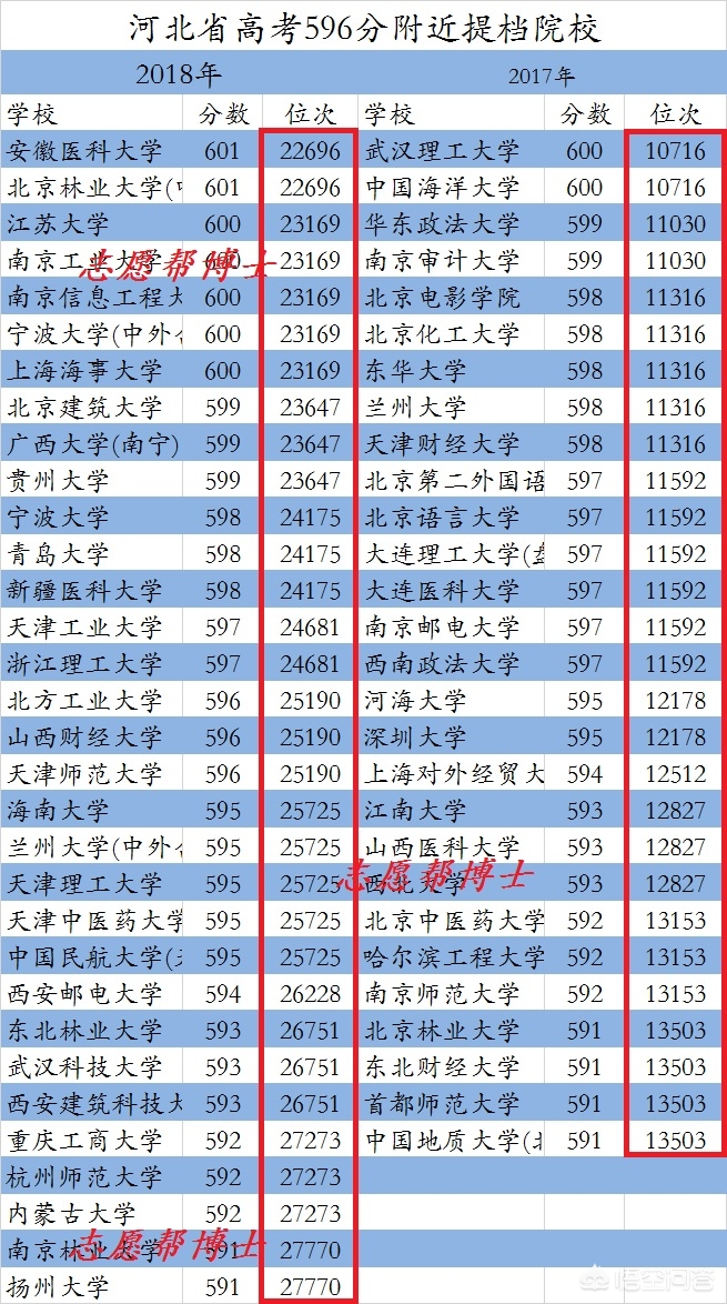 第三,近两年河北省高考596分报考院校的差距非常大。首先看一下2018年和2017年596分上下五分可以投档院校