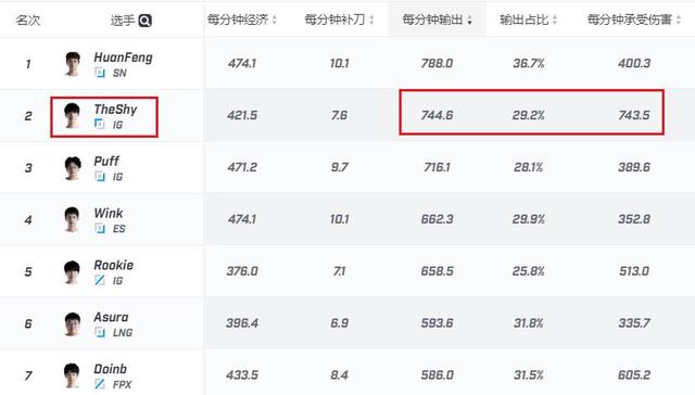 关键是TheShy令人佩服的点在于每分钟输出数据前十的基本上都是ADC或中单,就他一个上单混迹在里面,还排到了第二名,不给其他ADC活路的风格。