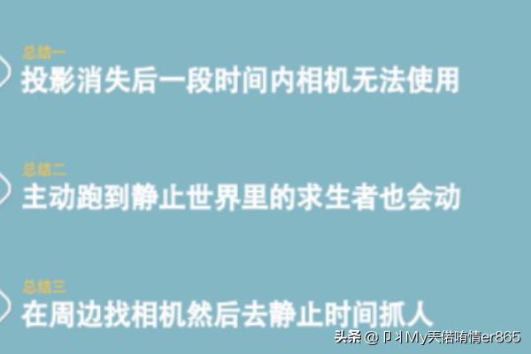 3.投影消失后一段时间内相机无法使用,静止世界里求生者是不动的,主动跑到静止世界里的求生者也会动。