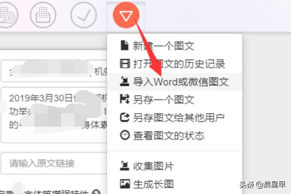 2、进入到了编辑界面后,点击如图所示的按钮,弹出的菜单中点击导入word或微信图文。