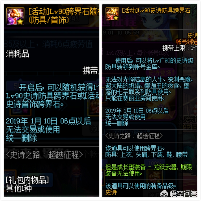 其次我们再来看看这两个跨界石的属性和完成条件,第一个是随机跨界石礼盒,玩家有可能抽到90史诗防具跨界石或90史诗首饰跨界石,但是只能跨界活动史诗,需要玩家连续刷24天史诗之路的副本即可获得。第二个跨界石只能跨界1—90级防具,刷够2万深渊票就可以领取。对于四等一的玩家来说无疑是个福利。