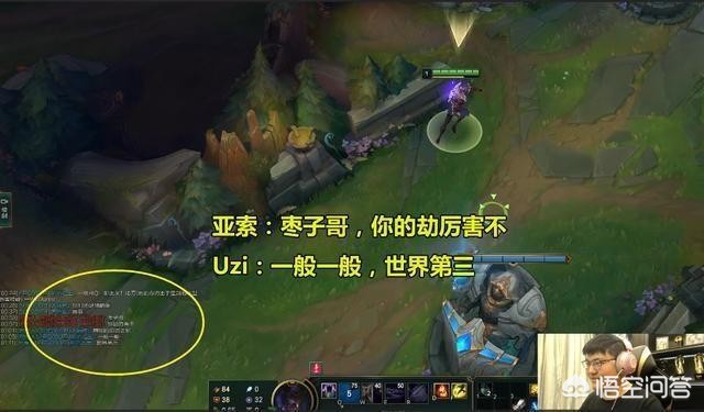 由于uzi开播已经有一段时间了,所以游戏里的玩家基本上已经认识他的ID,一出门对面的中单亚索就与其打招呼,并且还询问小狗他的劫厉害吗?此时uzi也是难得的“谦虚”了一波,低调回复道“一般一般世界第三”!