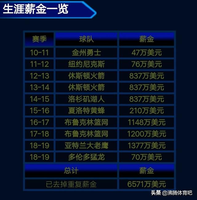以下是具体的薪金情况:除了2010-11、2011-12、2018-19三个赛季,林书豪的薪金并不低,最高可达到1377万美元,全部算下来的话,林书豪的生涯薪金总额高达6571万美元,这是大部分球员职业生涯都难以企及的一个金额高度!