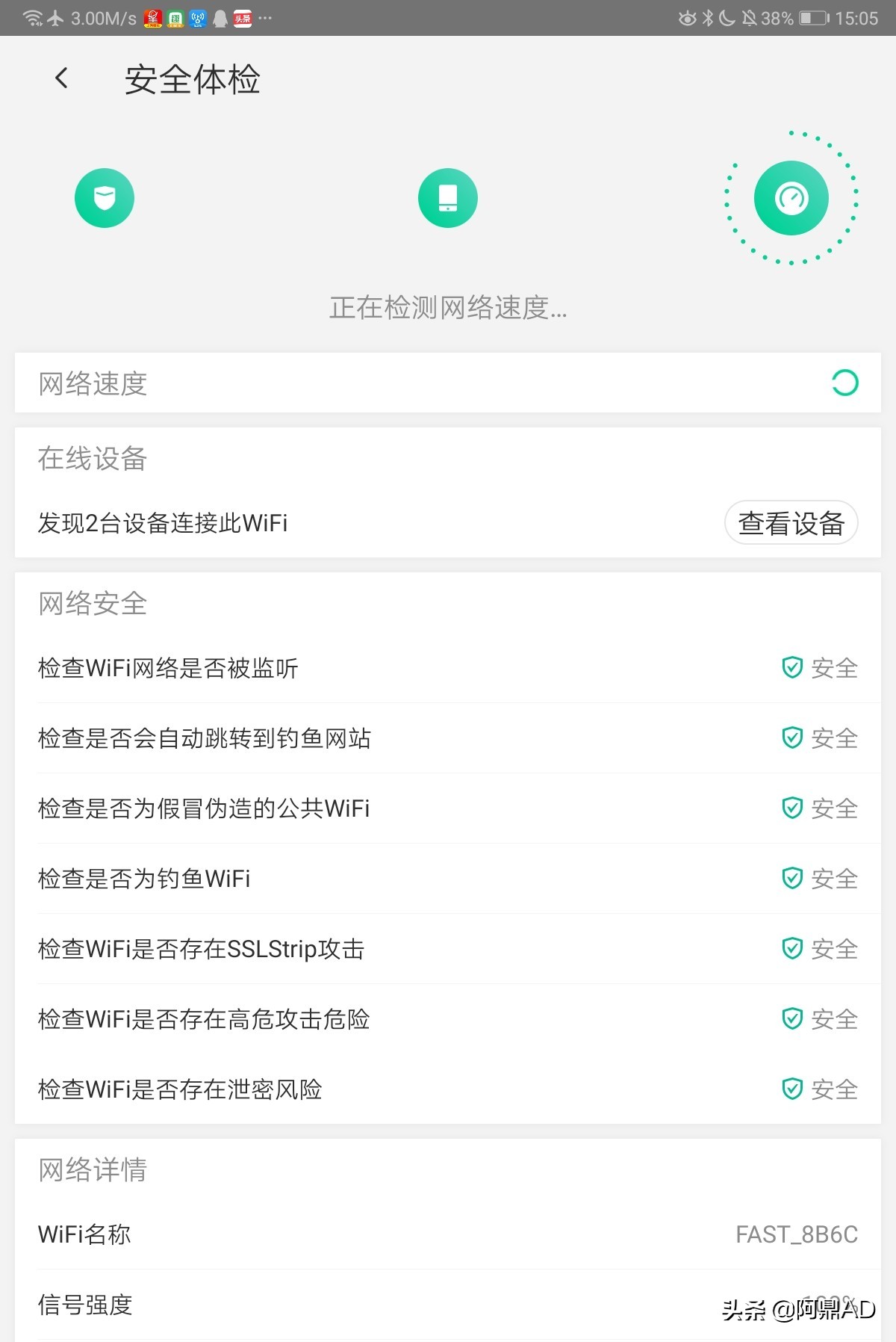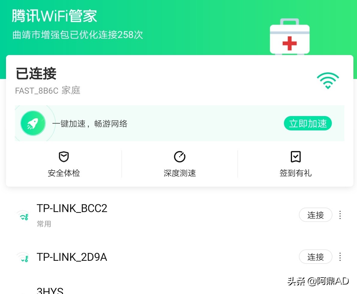 [应邀回答]有的。最靠谱的是腾讯wifi管家,测家里的宽带,还有加速功能,可以清理网络的垃圾,使用安全檢查,深度测速功能,就可以看到信号强度,连接上你的热点有多少台设备及型号,测速后也能看到你的速度相当于多少兆,网速是否超快。刚才去app那里又体验了一把并截屏3个作为配图。↓