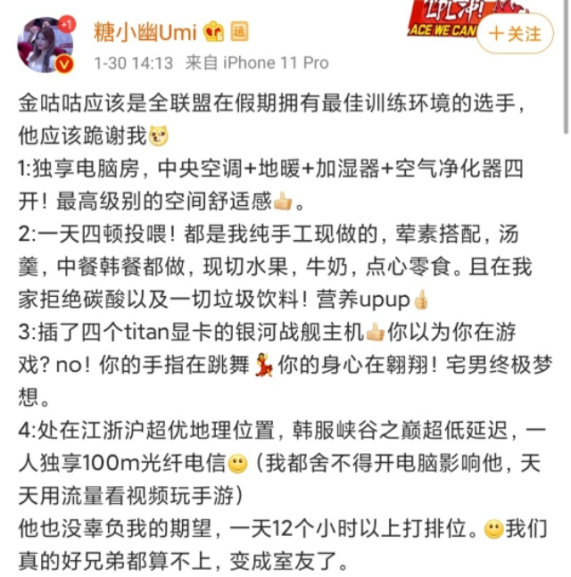 然而,Doinb在意气风发的时候虽然没有忘记糖小幽,但在那一股热血冷却之后似乎就有了一些转折!糖小幽近日在微博中发布"小作文"实名Diss金咕咕:因为网线的问题要和我冷战,平时给他伺候的白白胖胖,现如今稍微有点不顺心就开始不理人。刷锅洗碗和做饭、打扫卫生等等一系列家务活Doinb从来没碰过,现如今在Doinb心中似乎这是理所当然的事情。