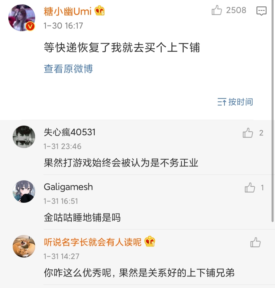 之后糖小幽看到自己似乎吐槽的太狠了,让很多水友都认为自己和Doinb的感情路走到了尽头,就立马发布了一条澄清微博:纯属是吐槽,并没有要和Doinb分家的意思,而Doinb事后也意识到自己的不对,各种献殷勤各种讨好!