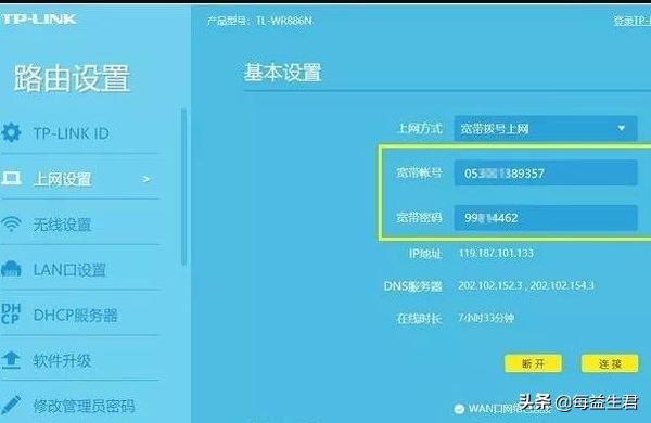 2、进入路由器后台界面后,切换到路由器设置中的“上网设置(有些为 LAN设置)”就可以看到宽带账号和密码了,如下图所示。