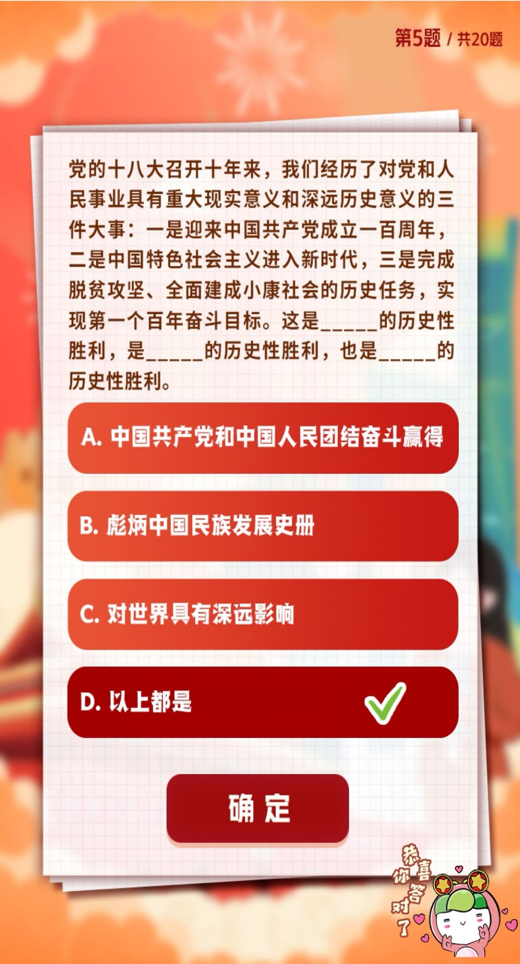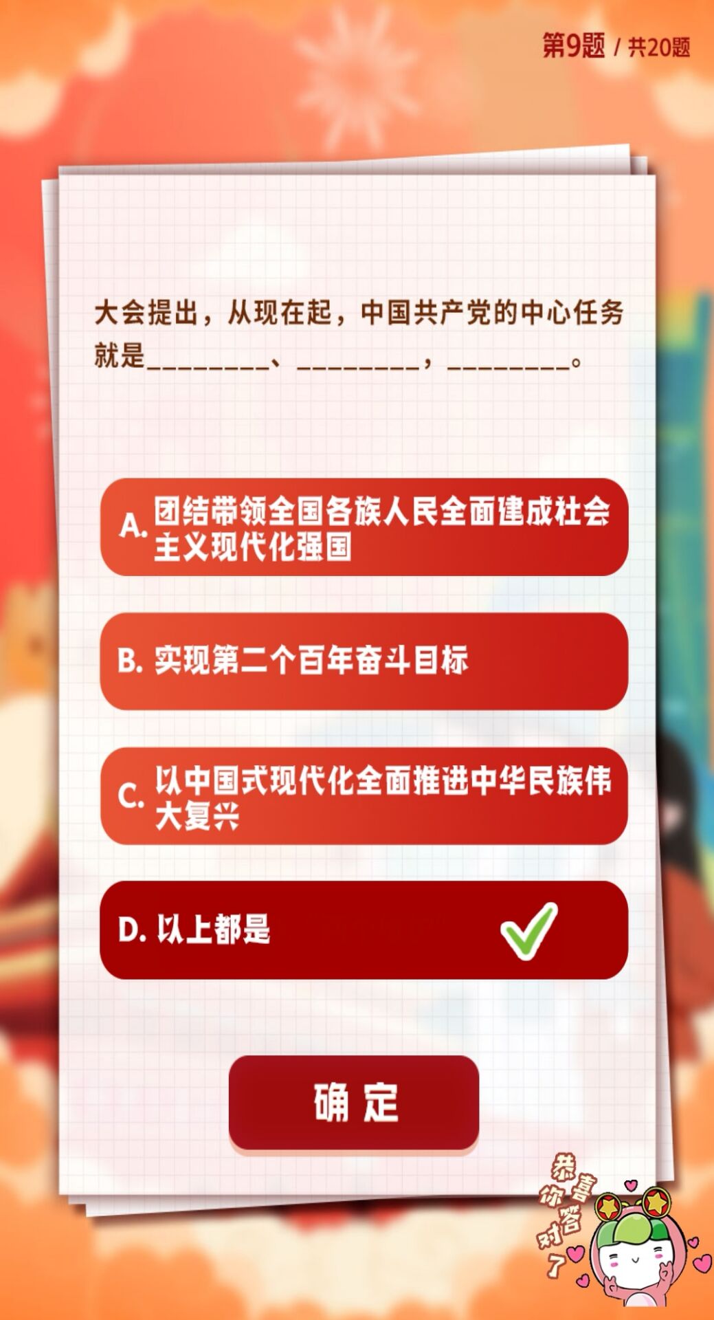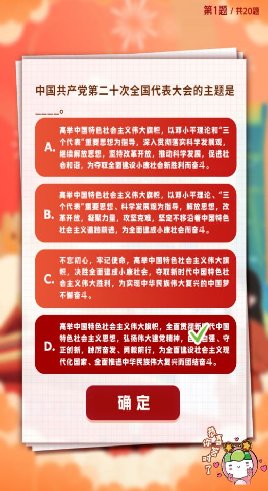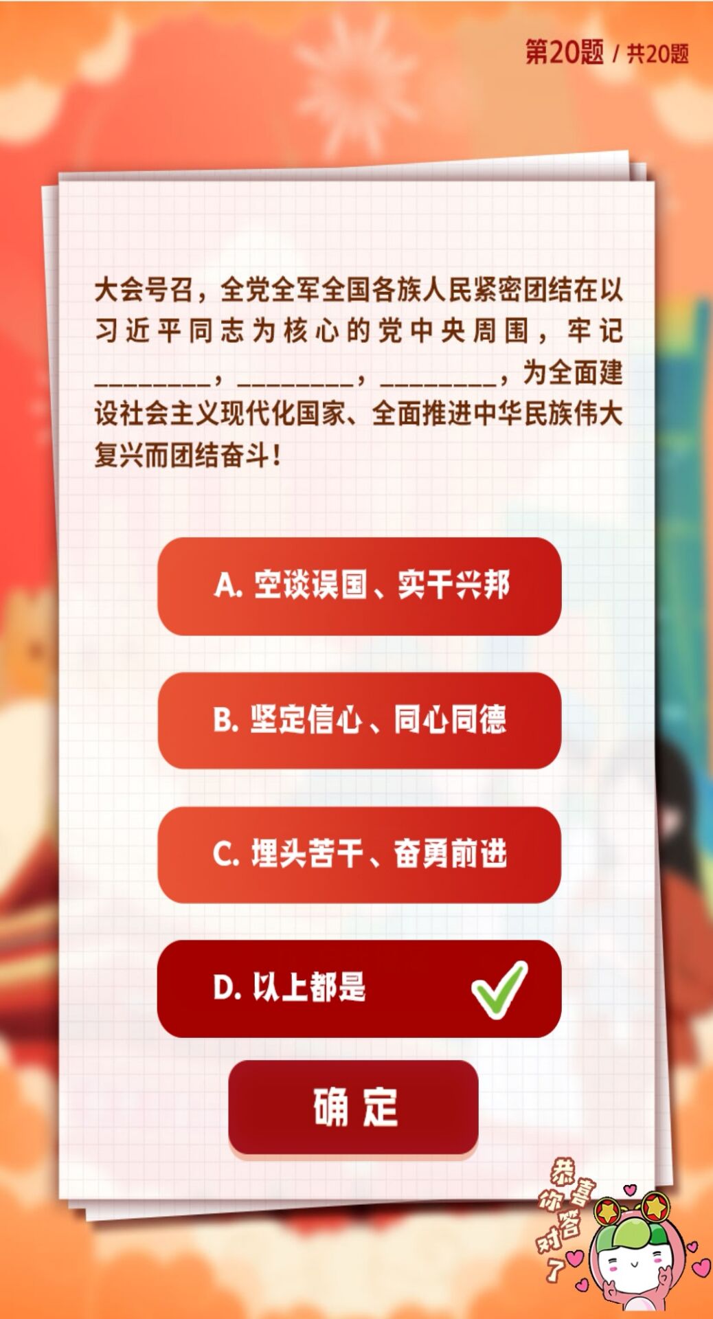 D.高举中国特色社会主义伟大旗帜,全面贯彻新时代中国特色社会主义思想,弘扬伟大建党精神,自信自强、守正创新,掉厉奋发、勇毅前行,为全面建设社会主义现代化国家、全面推进中华民族伟大复兴而团结奋斗。