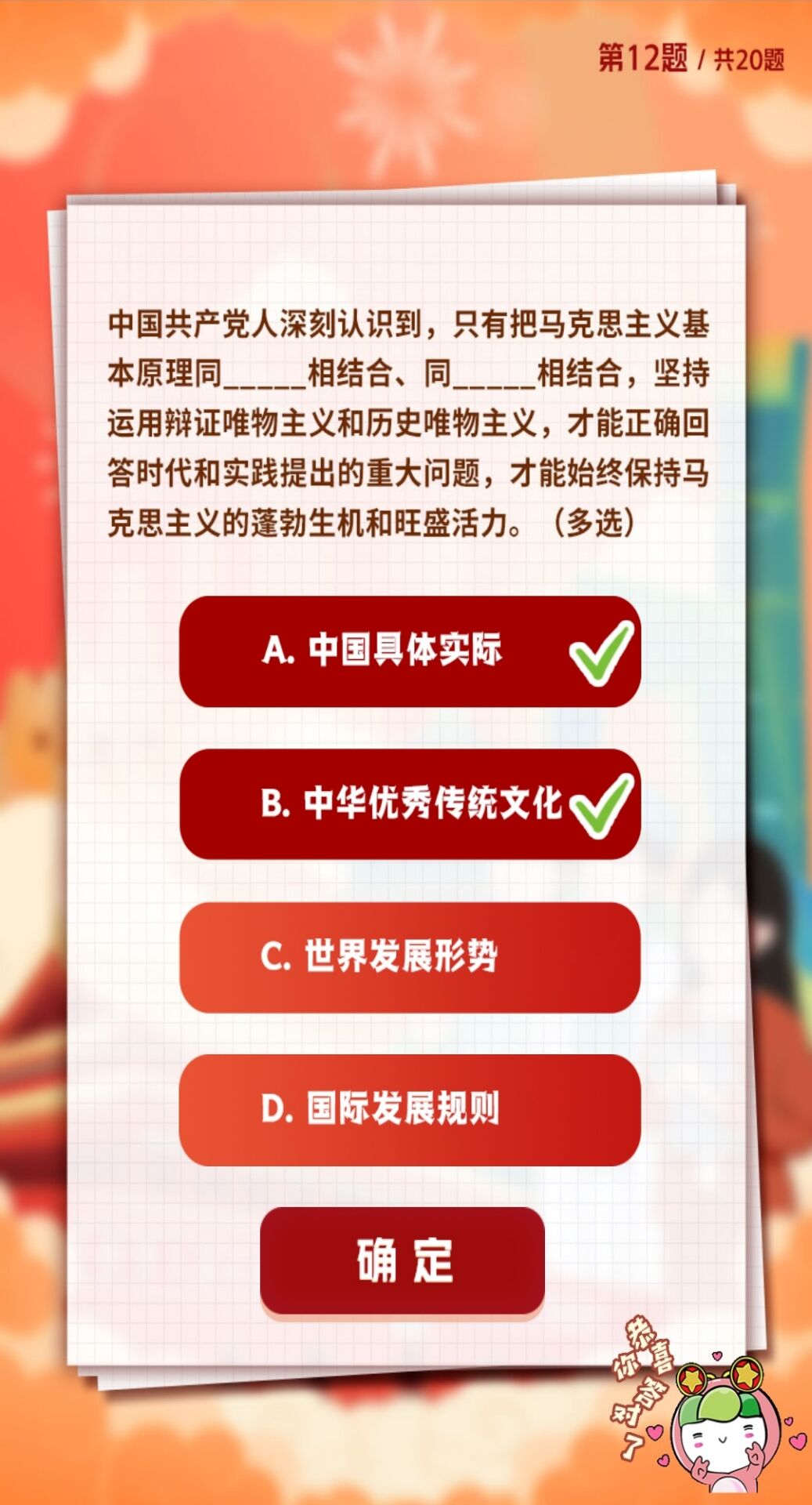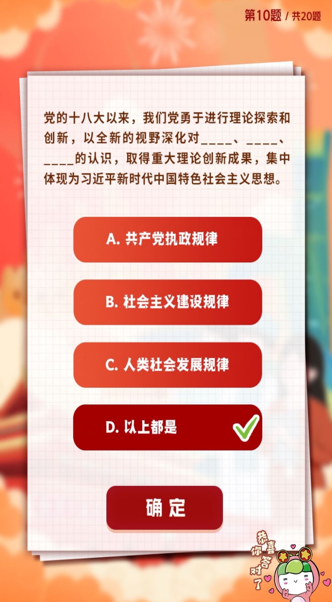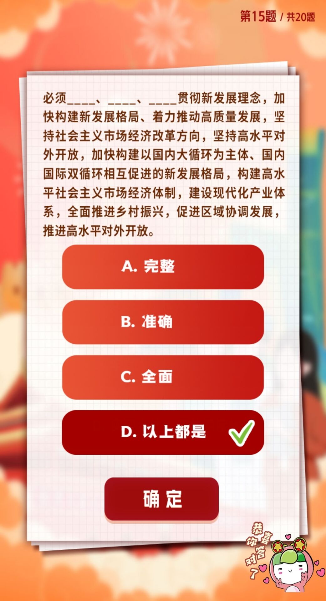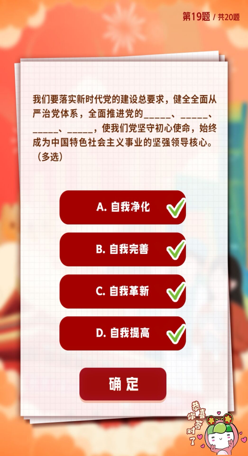 D.高举中国特色社会主义伟大旗帜,全面贯彻新时代中国特色社会主义思想,弘扬伟大建党精神,自信自强、守正创新,掉厉奋发、勇毅前行,为全面建设社会主义现代化国家、全面推进中华民族伟大复兴而团结奋斗。