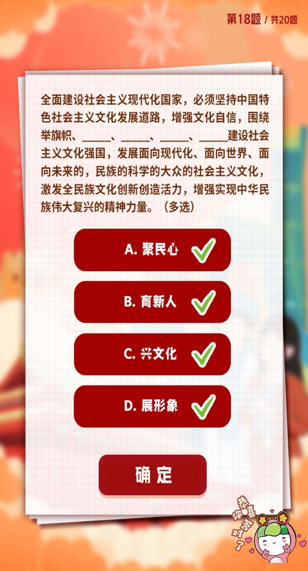 全面建设社会主义现代化国家,必须坚持中国特色社会主义文化发展道路,增强文化自信,围绕举旗帜、、、、建设社会主义文化强国,发展面向现代化、面向世界、面向未来的,民族的科学的大众的社会主义文化,激发全民族文化创新创造活力,增强实现中华民族伟大复兴的精神力量。(多选)