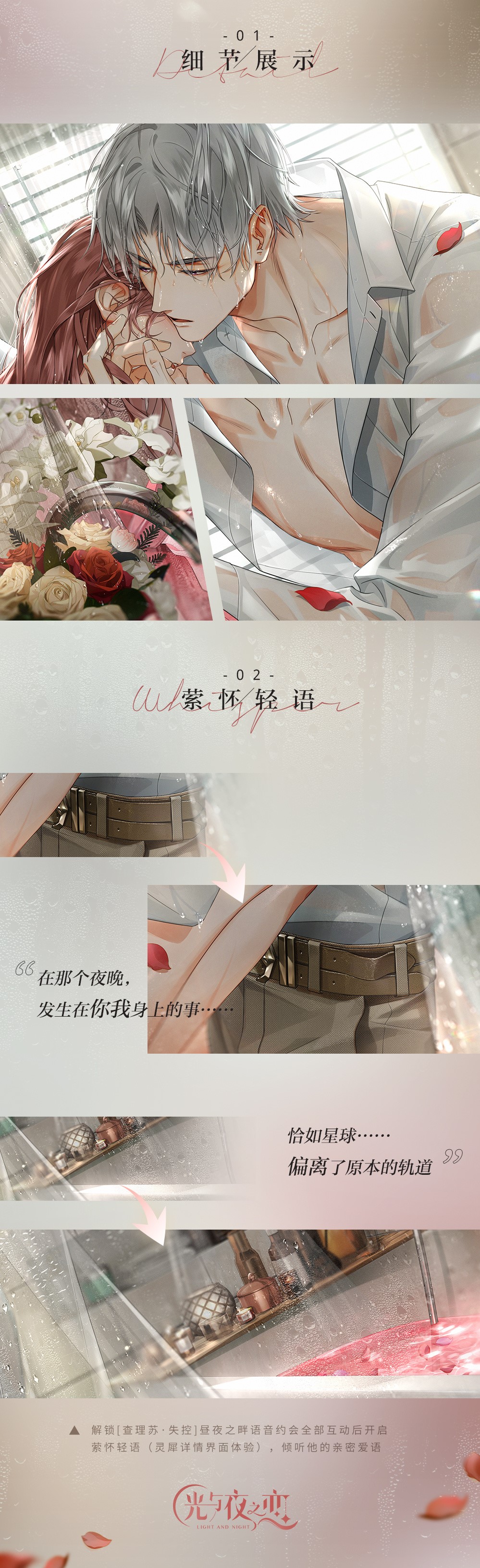 解锁[查理苏・失控]昼夜之畔语音约会全部互动后可在【灵犀详情界面】开启专属系统【萦怀轻语】,鉴赏全画幅光影,倾听他的亲密爱语。