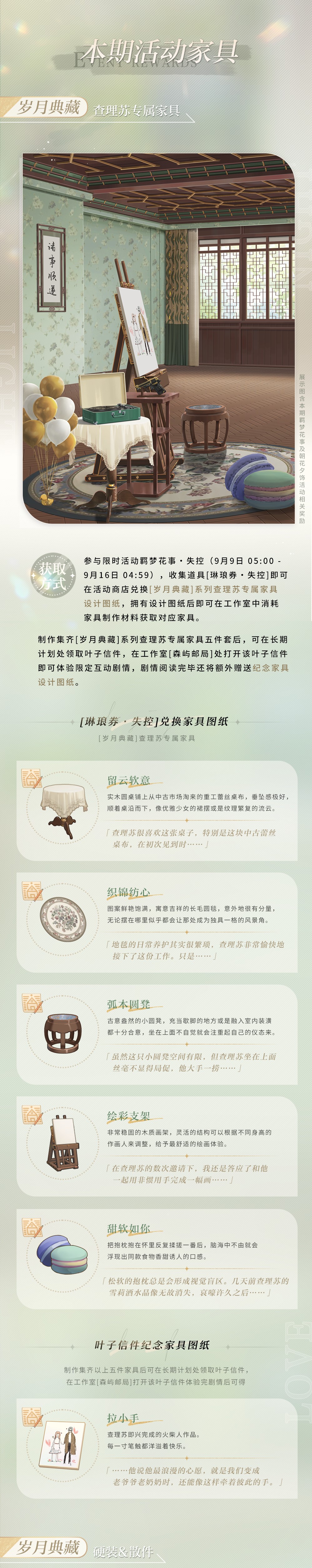 获得[查理苏・失控]并达成一定培养条件后,即可在灵犀详情界面左上角灵犀奖励处领取【附赠限定家具图纸】,拥有图纸后即可在工作室中消耗家具制作材料获取对应家具。