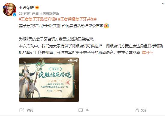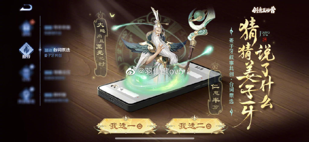 本次活动中,我们为大家提供了两版台词可供选择,两版台词方案在表达角色目标和动机的基础上各有侧重,获胜方案将用于姜子牙的移动语音,并在英雄品质升级完成后跟大家正式见面
