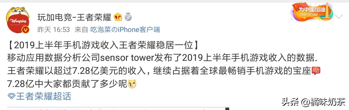 近期,网上发布了全球手游收入的排名,其中本土游戏王者荣耀再度登顶全球最畅销的游戏,以7.28亿美元的收入稳居第一,这款从2016秒钟左右开始兴起的手游,已经不知不觉走过16个赛季了,它陪伴很多人收获感情,友情,以及走过一个个开心的日子,7.28亿你贡献了多少呢,欢迎在评论区留言哦!
