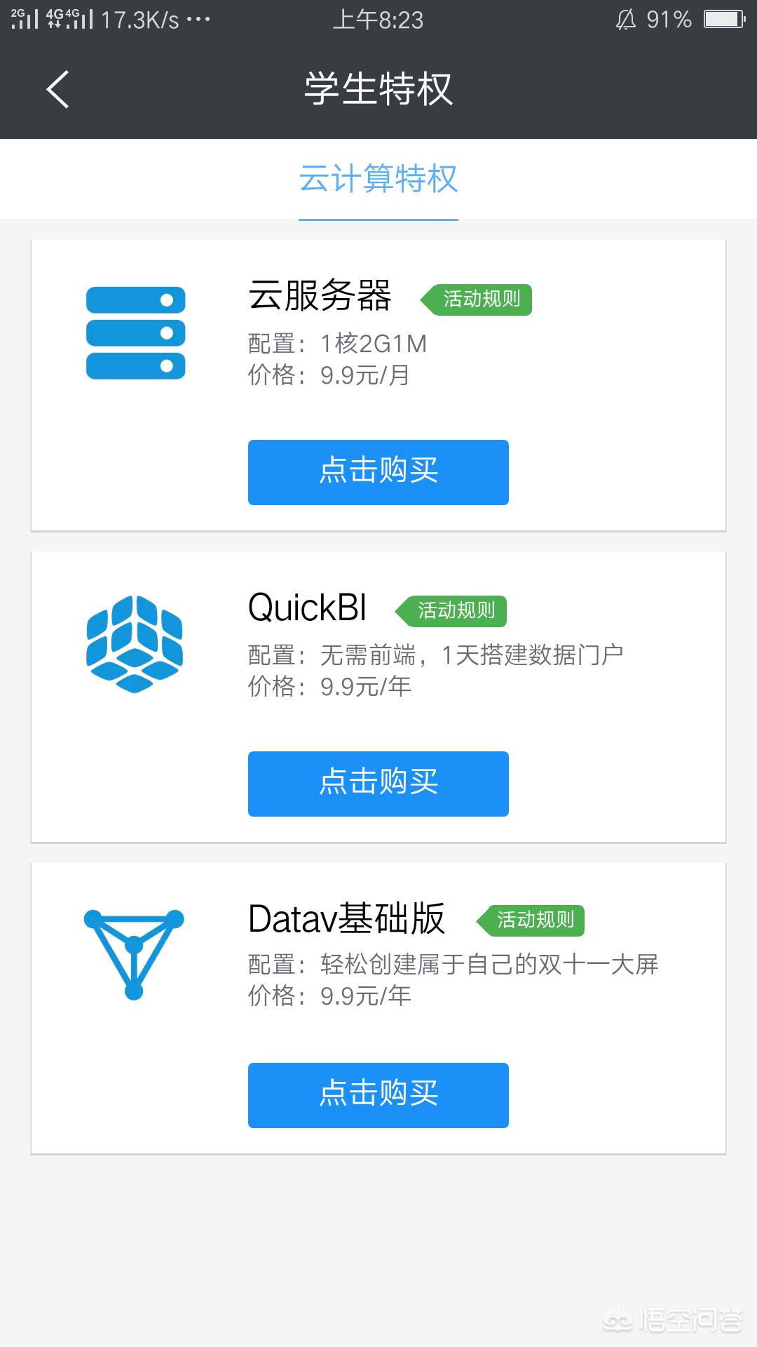 如果是学生的话,建议用阿里云的服务器,因为阿里云对大学生有补助,可以通过低价买到一台适用于小型企业的服务器,每月只需要9.9元,如果通过电脑上浏览器,每月付款的话,还可以抽取5元优惠券,相当于4.9元一个月