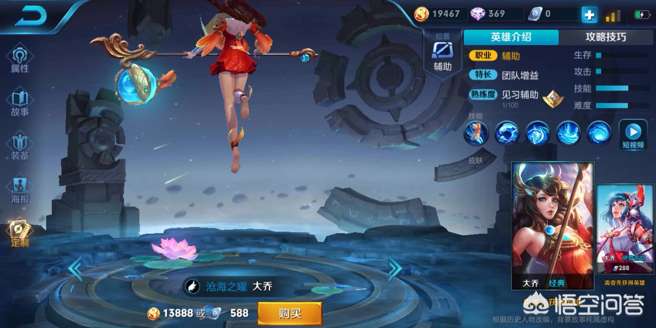 第三位最强的辅助就是大乔啦,这个英雄就狠了,二技能加大招全员满血回归战场,靠一技能加速和被动加速加快打野节奏,配合李白阿离这样的打野更是在前期无敌续航,如果是五排阵容的话,配合大乔这个英雄简直是无解的对于这点,我们可以在kpl比赛当中看到的。