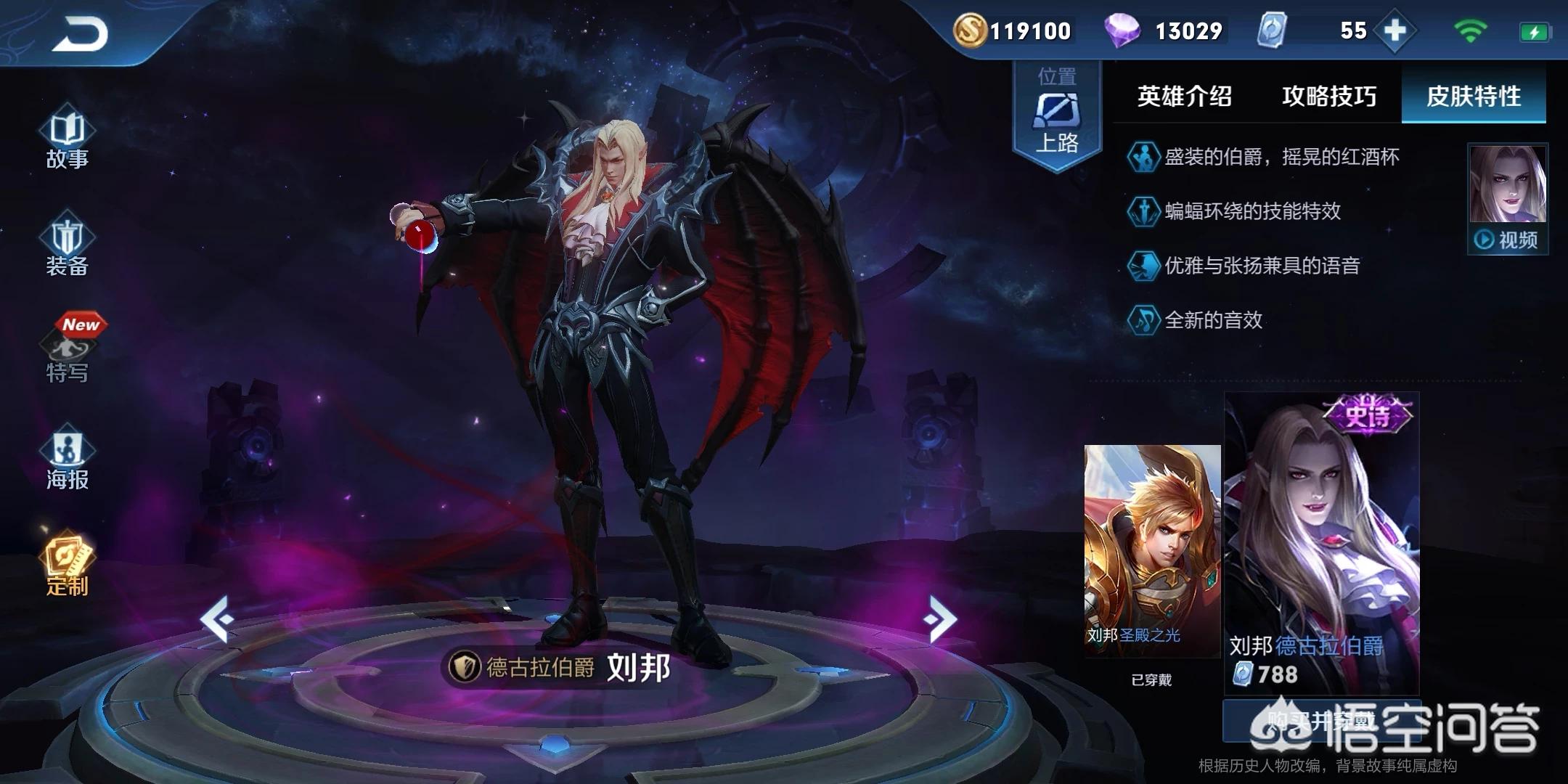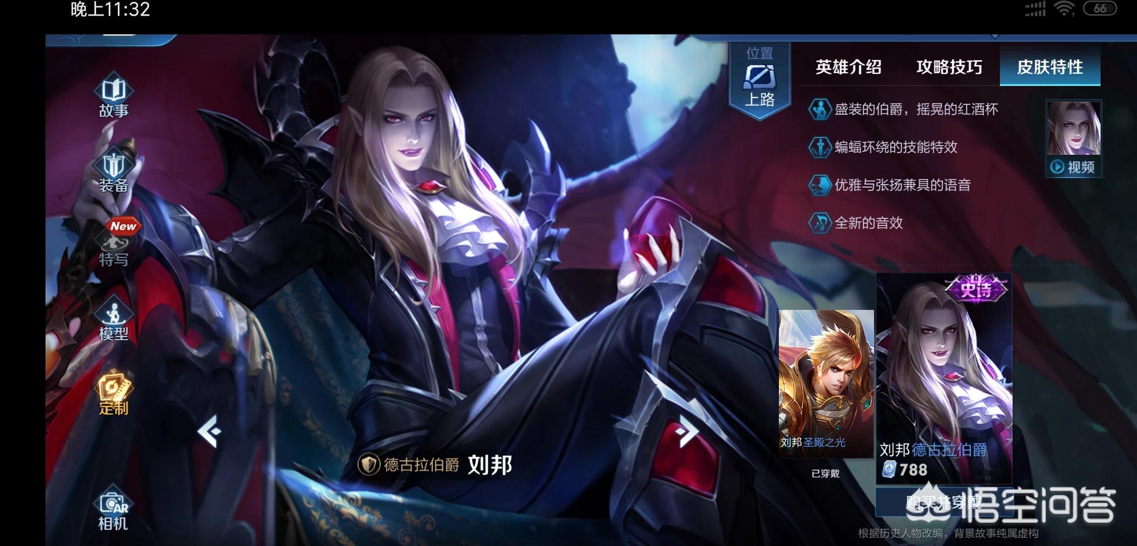 第二个我比较推荐大家兑换的,就是刘邦的德古拉伯爵,在刘邦的几款皮肤里面,另一款是伴生皮肤,品质特别的差,手感也和原皮差不多,而这款刘邦的德古拉伯爵,是一个史诗品质的皮肤,价值78块钱,手感还是很不错的,不管是技能特效还是音效都特别的不错,优雅与张扬兼具的语音,蝙蝠环绕的技能特效,很值得兑换。