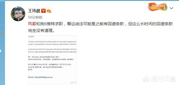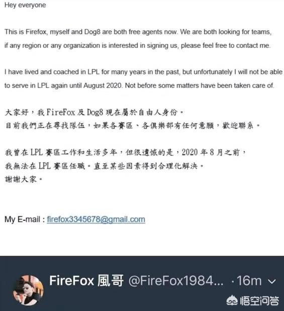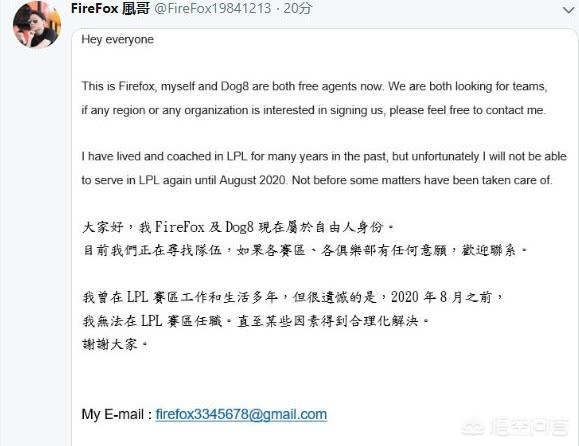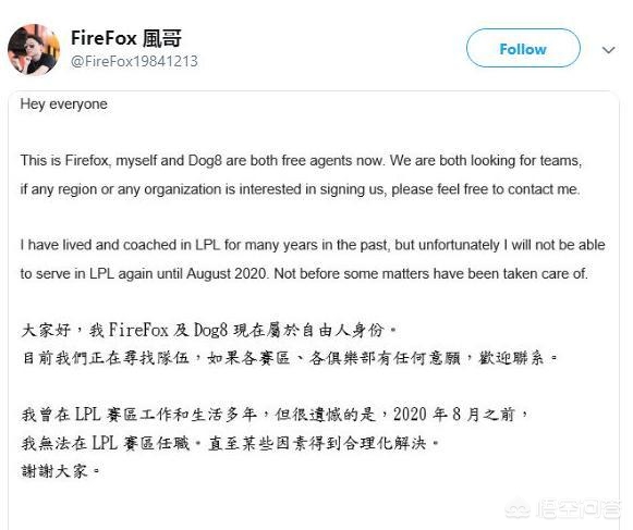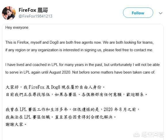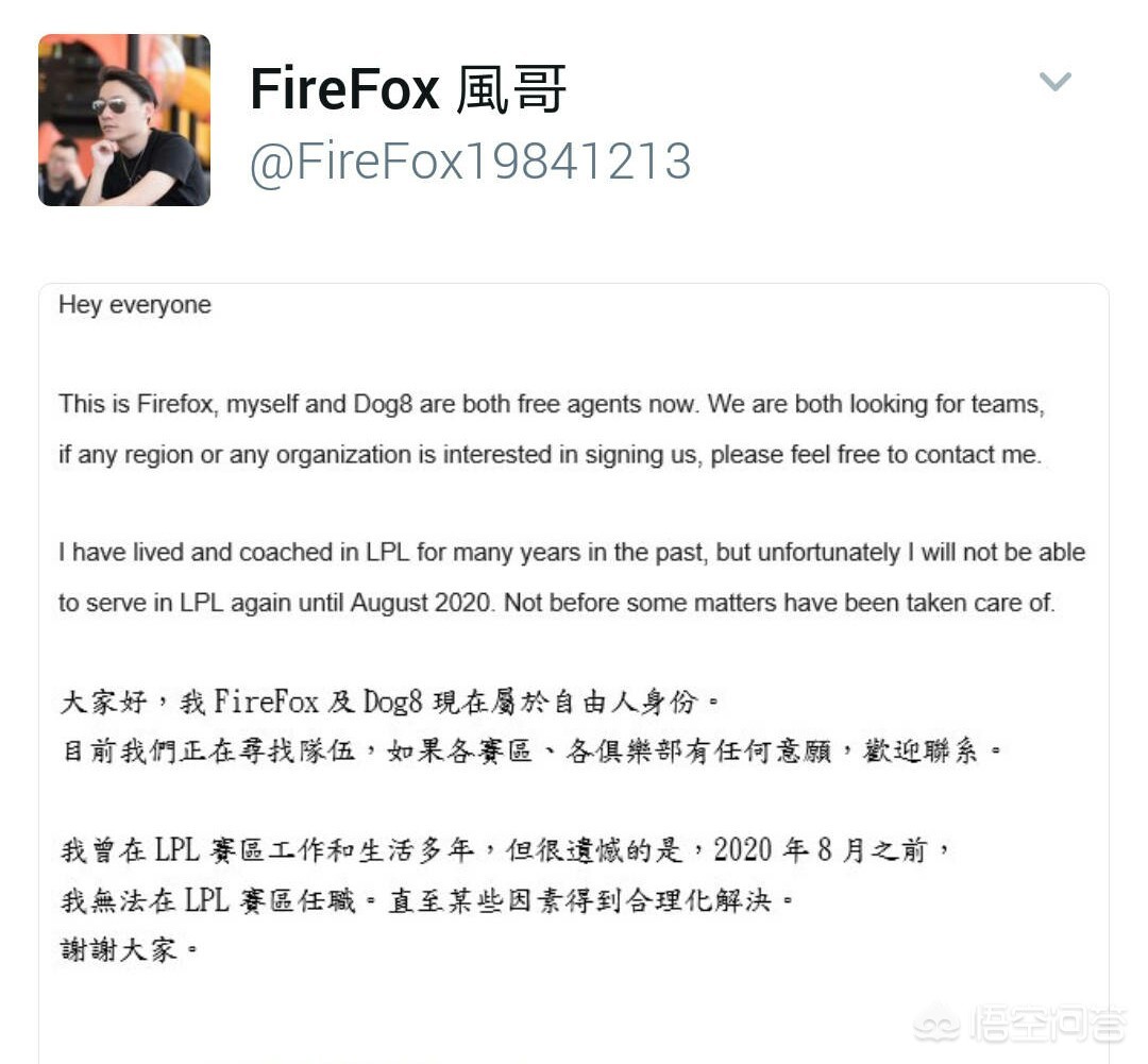 近日风哥发表了声明,表示自己和狗8现在已经是自由人的身份,目前正在全力的寻找队伍,如果有俱乐部需要欢迎联系。但是这一句话却是引发了网友们的深思,我曾在LPL赛区工作和生活多年,但是非常的遗憾,2020年8月份之前,我将无法去LPL赛区,直至某些因素得到合理化解决。