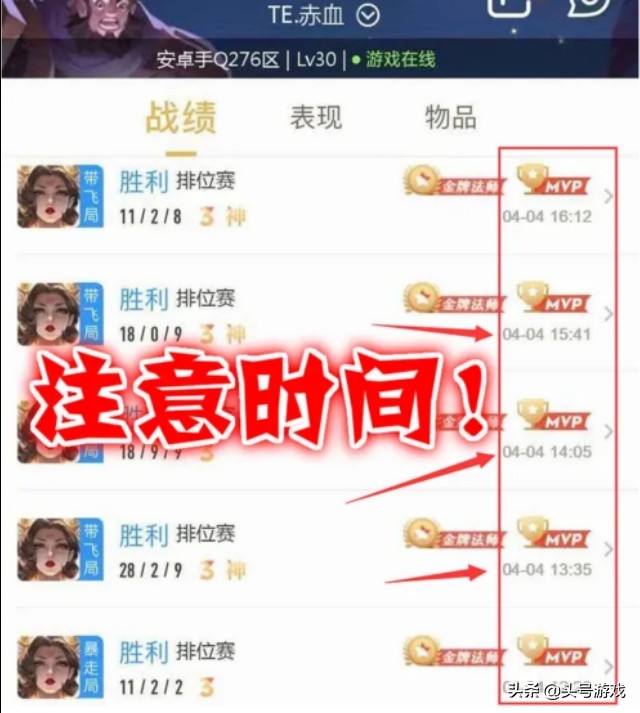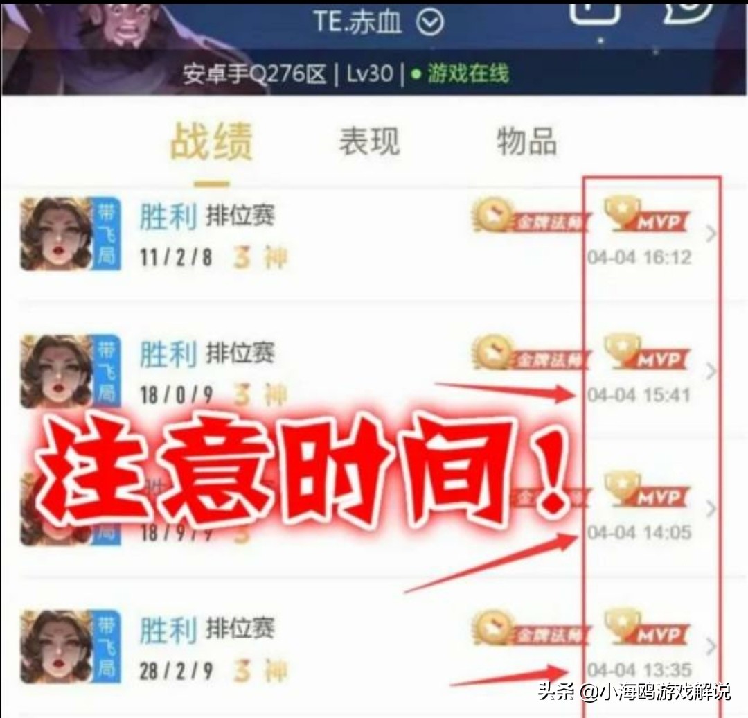 首先我们来看一下这位玩家的游戏时间,他的游戏时间竟然在4月4号的时候,基本上在昨天的时候,一整天都在打游戏,但是我们都知道,在昨天的时候,所有的游戏是不能够进入服务器的,也就是从零点之后一天的时间都没有办法玩游戏,所以想要上分的话,根本是不可能的,但是这位玩家的游戏时间确实在昨天,主要的原因就是使用了一些特殊的东西,所以才会在游戏里面可以简单的上分,一直获得胜利。