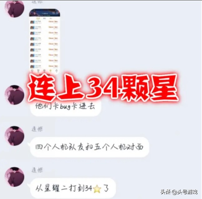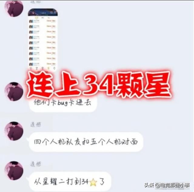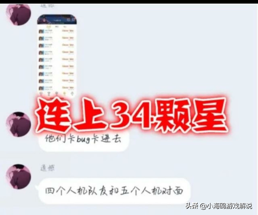 并且根据他们的说法,就是卡了一个系统的bug,这个bug的具体情况我也是具体的了解了一下,原来是昨天的时候,所有人都没办法登录游戏,但是有一些玩家利用漏洞的原因进入到游戏里面,进入游戏里面之后,因为没有玩家的原因,所以直接在排位赛里面匹配的全部都是人机,也就是自己带了四个人机和对面五个人机对打,轻轻松松就获得了胜利,从星耀二段位直接到达了王者34星。