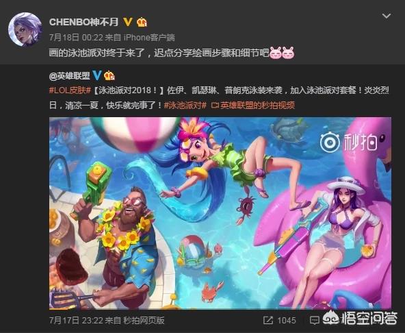 很高兴能回答这个问题。首先了解一下本次泳池派对系列皮肤出自中国画师CHENBO(团队)(不知道汉字,不敢瞎猜,微博:CHENBO神不月) 。(见图1)
