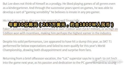 根据韩媒报道,FAKER以30亿韩元的年薪正式续约SKT,折合人民币1800W元,267万美元,创了韩国职业选手签约费的新高。这个消息随后引发了韩国网友的激烈讨论。有网友说:FAKER简直就是LOL界的梅西啊!也有网友说:SKT=FAKER!所以今后SKT今后的建队思路,也肯定是围绕李哥来进行。