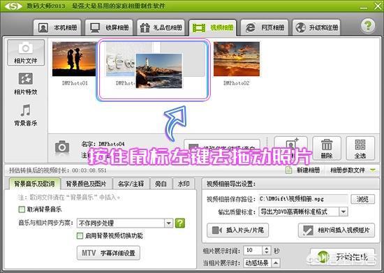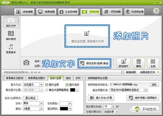 点击“添加相片”把照片一次性都加入到数码大师里。按住鼠标左键来拖动照片,可以改变照片的播放顺序。点击“修改名字/注释/旁白”可以给照片命名、加文字。