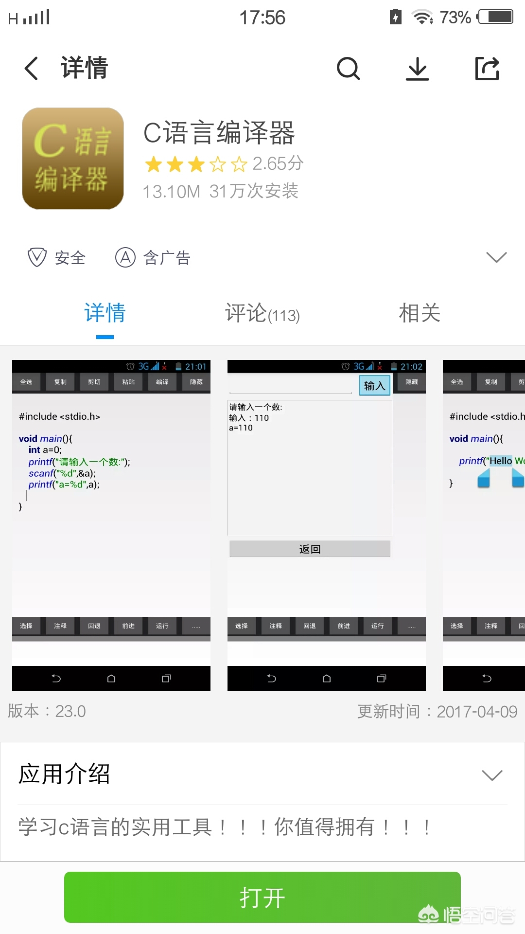 1.安装C语言编译器,这个直接在手机应用中搜索就行,大概也就13兆左右,直接点击下载就行,如下:
