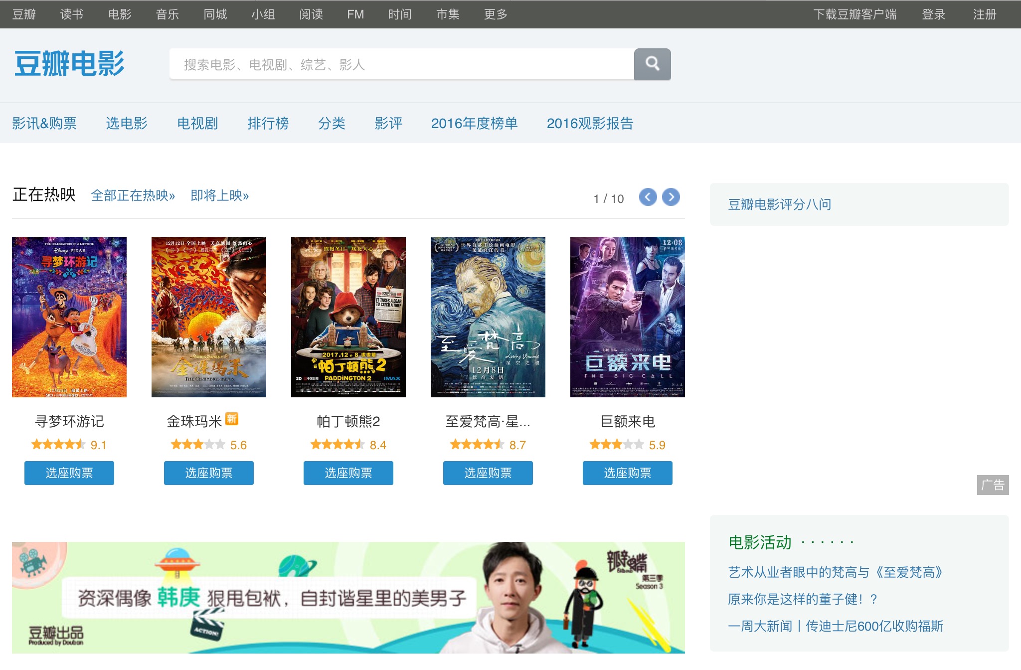 大家应该是比较熟悉的,豆瓣电影包括评分、讨论区、简介、卡司、获奖情况、剧照视频、相关类型推荐,还有短评和长评。
