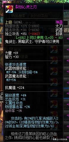 火属性攻击,以及攻击时,有2%的几率消减敌人20%的血量,这是当年非常特殊的一把武器,它的存在导致了很多武器的不平衡,可能正是因为端游裂创的属性变态,和不平衡导致了手游中的更改吧,也有可能是因为百分比消血这个系统不好做,容易出BUG,虽然会引起不平衡,但是这把武器也是当年DNF的一种特色,手游中裂创拍卖行的价格也不是很高,相比于以前的裂创价格占比真的是低了很多,回不去的青春,回不去的裂创