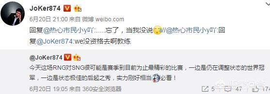 事件回顾:今天RNG对阵SNG的比赛结束后,LPL著名解说Joker发微博表示“RNG与SNG的表示非常好看,甚至是夏季赛以来最精彩的对决,一边是仍在调整状态的世界关注,一边是状态极佳的后起之秀,实力刚好相当”。