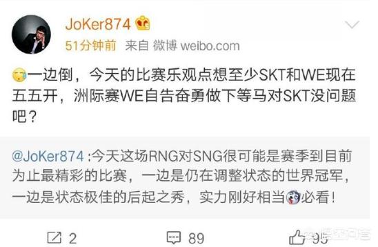 随后Joker发文称:局势一边倒,不知是有意还是故意把话题往WE身上扯,乐观点至少现在的WE和SKT55开,洲际赛WE对上SKT应该没问题。而今年参加洲际赛的四支LPL队伍为:RNG,EDG,RW和IG,哪里来的WE?