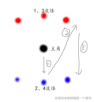 刷完第二波骗骗花会在第一波骗骗花的位置刷3个妙脆角,因为妙脆角攻击距离比较远,可以按路线②跑到右侧或者左侧,让一边的自动寻路过来聚拢,一顿操作猛K。