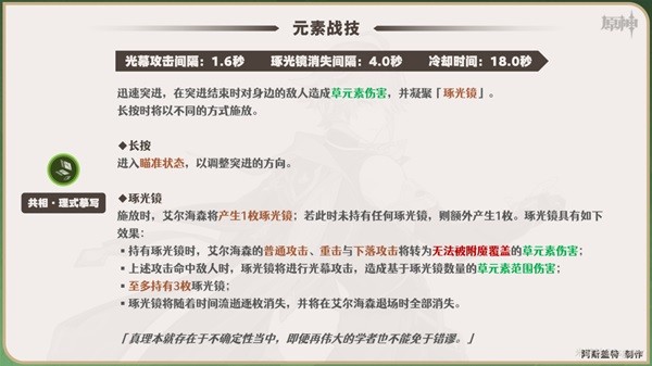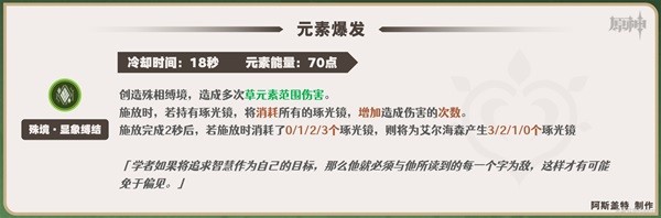 ③.解锁4命后,会根据施放元素爆发时消耗和产生的琢光镜数目分别提升队友的精通、艾尔海森的草伤加成,在施放时更多注意当前的琢光镜数目,推荐在琢光镜少于2枚时施放大招使艾尔海森获得草伤加成。