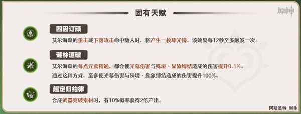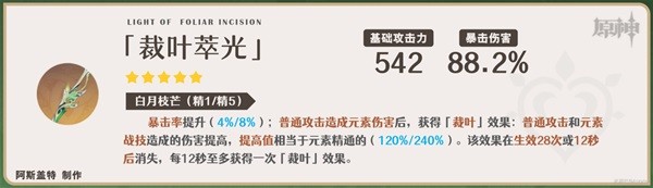 艾尔海森的毕业武器,其可以充分发挥武器被动特效,通过堆叠元素精通进而提高艾尔海森的普攻、战技伤害。该伤害提升属于基础倍率区间,与“基础属性×技能倍率”相加计算。选择该武器时可以考虑暴击头冠。