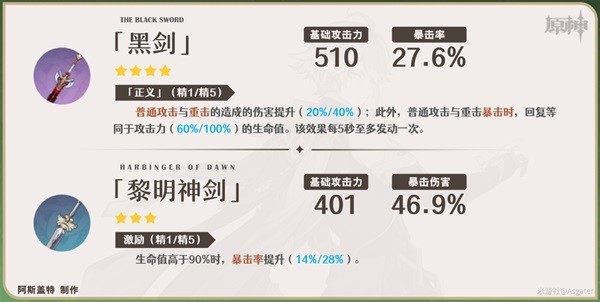 当队内具有护盾辅助时,可优先考虑黎明神剑,其能够提供高额暴击率、暴击伤害,且获取途径简单。黑剑的整体性价比较低,需要高精练才能获得更高的普攻伤害加成。