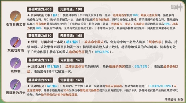 ①.当没有上述暴击、暴伤类武器时,可以考虑选择精通类武器,该类武器主要搭配激化玩法的艾尔海森,当选择激绽、妮绽队伍时,该类武器的优先级将会有所下降。