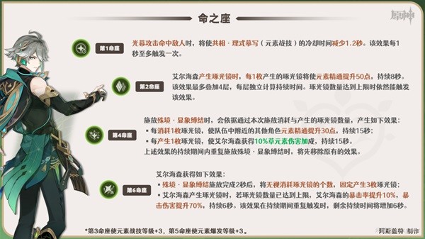 ④.解锁6命后,施放元素爆发将固定产生3枚琢光镜,可通过第4命座获得稳定30%草伤加成,并且在艾尔海森的输出过程中若产生琢光镜,将提升其暴击率和暴击伤害,进一步提高艾尔海森的输出能力(该额外暴击率、暴击伤害提升不会直接计入角色的属性面板中)。