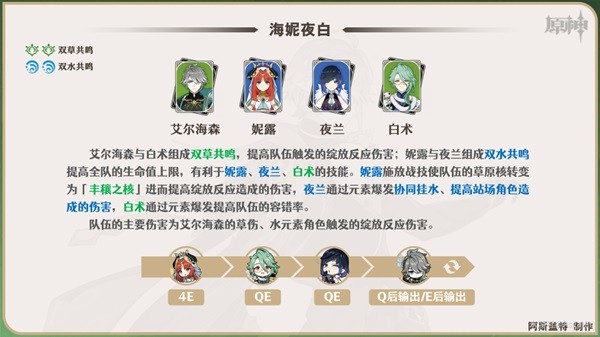 艾尔海森为草元素角色,在搭配队伍时推荐围绕着草元素反应进行选择,可以分为雷草激化队、绽放队等队伍搭配,其中激化队则会最大程度上利用艾尔海森的技能附着频率提高其输出能力,而绽放队则偏向运用元素反应(草原核)补充队伍伤害。
