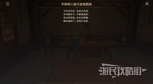 往下飞到铜雀庙,可以在供桌上看到魈作的诗。