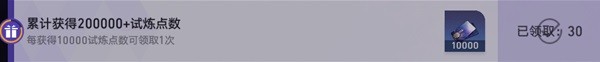 ★奖励:每获得10000试炼点数可领取1次,共30w信用点;