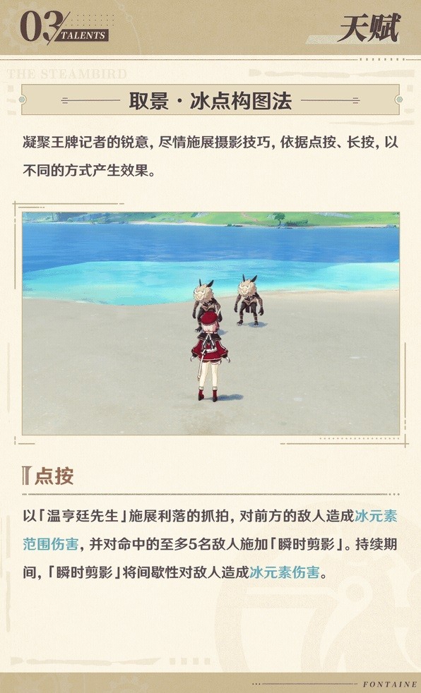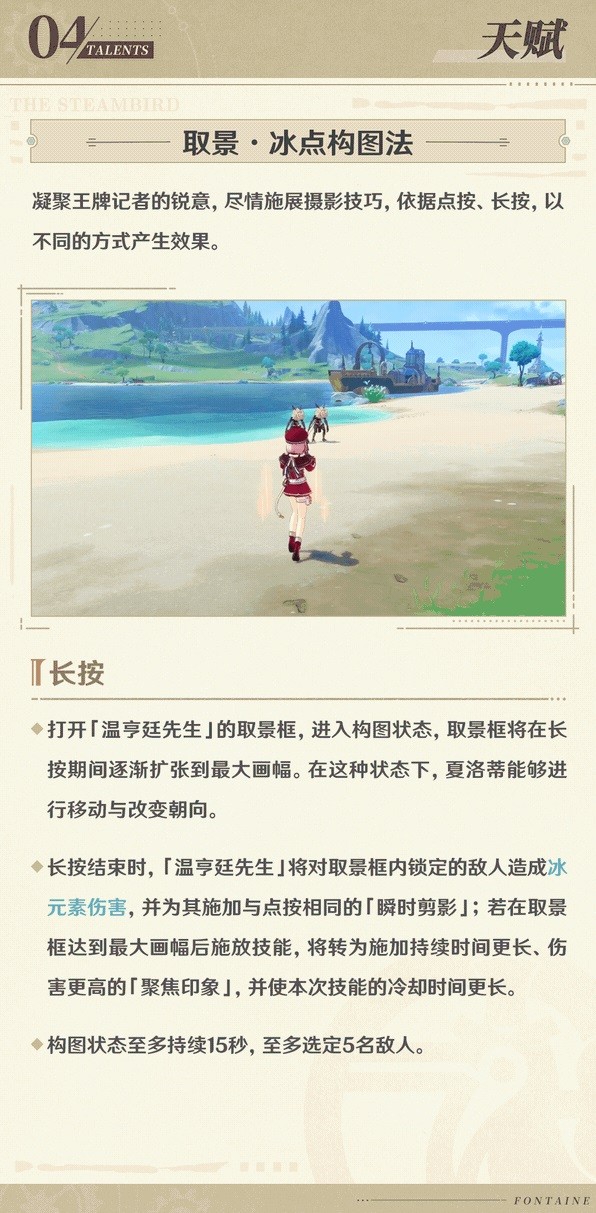长按结束时,将对取景框内锁定的敌人造成冰元素伤害,并为其施加与点按持续伤害;