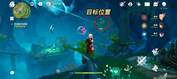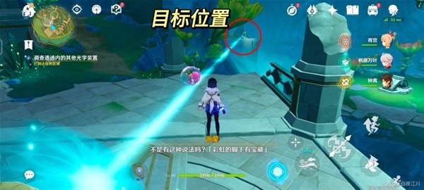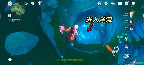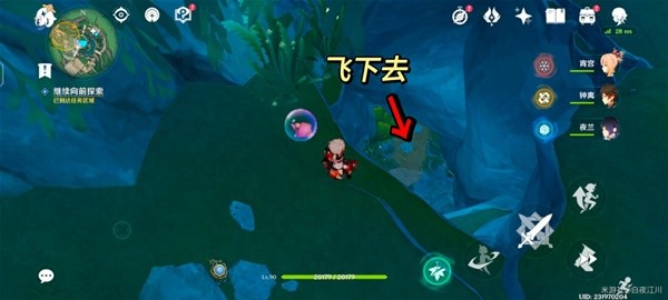 炸开后沿着水道往下游,中途有一个神瞳大家可以顺便拿了。游到尽头会脱离水体,及时打开风之翼或者下落攻击,小心角色摔伤。