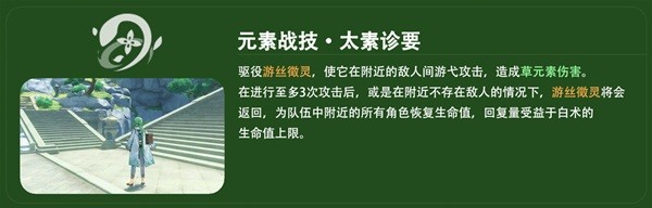 元素战技往前方驱役游丝徵灵并在三名敌人之间弹跳造成草元素伤害,并在回归角色身上时给全队角色恢复生命值,该天赋为白术获取元素能量的主要来源,且恢复的生命值也较高,可以和元素爆发一同升级。