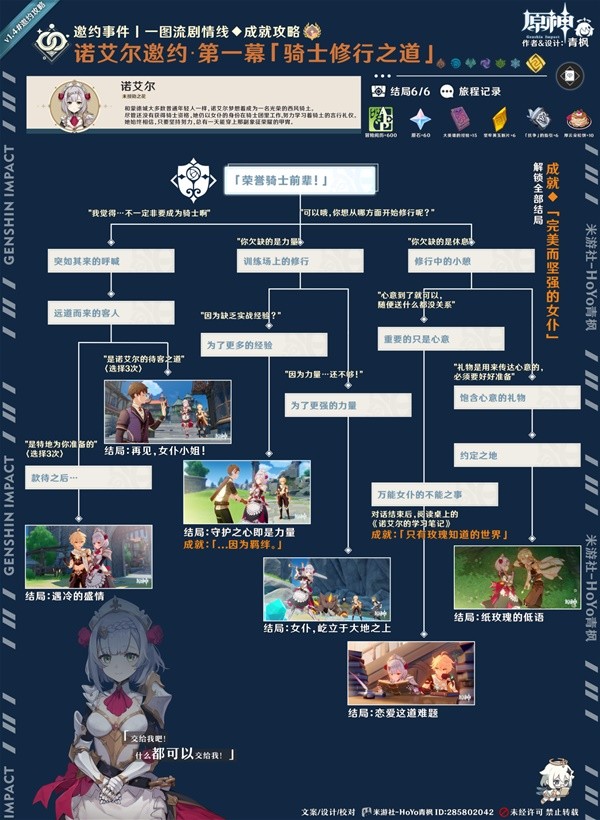 有很多玩家想知道《原神》中诺艾尔邀约剧情线如何选择,下面就给大家带来《原神》诺艾尔邀约·第一幕「骑士修行之道」选择指南,按照图鉴中剧情节点标识的选项,选择后进入不同的剧情走向完成全部分支即可,未标注的其他选项随意选择就好,并不会影响剧情发展!