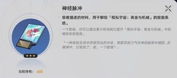 在黄金与机械中,我们模拟宇宙常规的技能树和寰宇蝗灾的技能树并不会生效,但黄金与机械又提供了“神经网络”这一个专属于黄金与机械的技能树系统,我们可以通过探索黄金与机械来获得“神经脉冲”,使用“神经脉冲”来激活神经网络节点,以此获得额外增益效果。