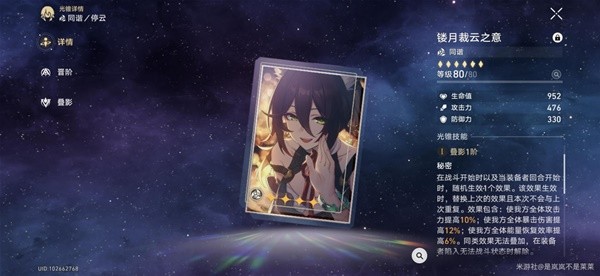 大月卡光锥【镂月在云之意】推荐理由提供随机三种buff:充能、爆伤、攻击,唯一的缺点是不好叠满所以不太推荐。叠满是攻击力20%、爆伤24%、充能12%,这张光锥就看配队配置需要就行,有停云就给停云用。