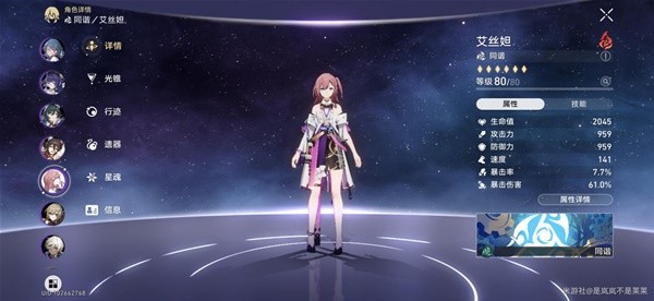首先看我的艾丝妲面板只提了速度,暴击率没怎么练,爆伤也不高。
