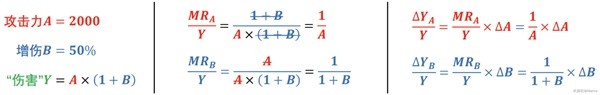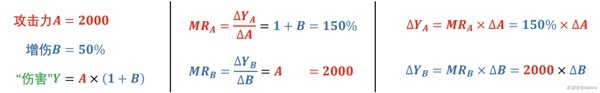 「攻击的边际收益率」,只与「攻击」有关,且随着攻击A的增大而减小;增伤亦然。