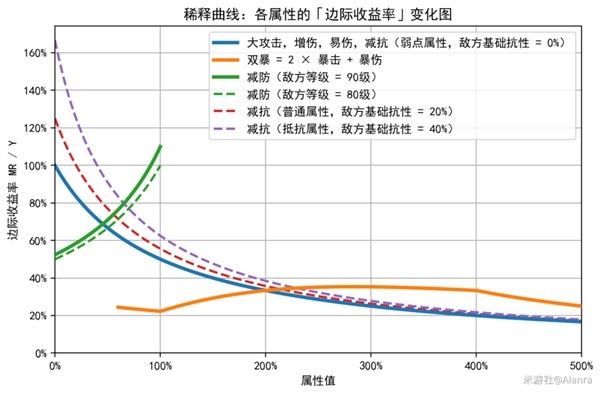 3.稀释:边际收益率递减,随着属性的增加,每增加1单位带来的「伤害变动百分比」不断下降。
